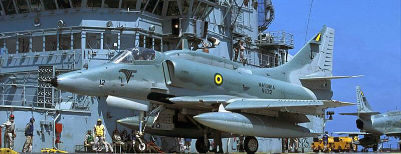 Nossas Forças Armadas têm a maior frota de aeronaves militares na América Latina. Embora a maior parte seja da Força Aérea Brasileira, a Marinha do Brasil tem não apenas helicópteros como aviões de vigilância e também de ataque como o McDonnell Douglas A-4 Skyhawk da imagem acima, desenvolvido especialmente para operar a partir de porta-aviões.