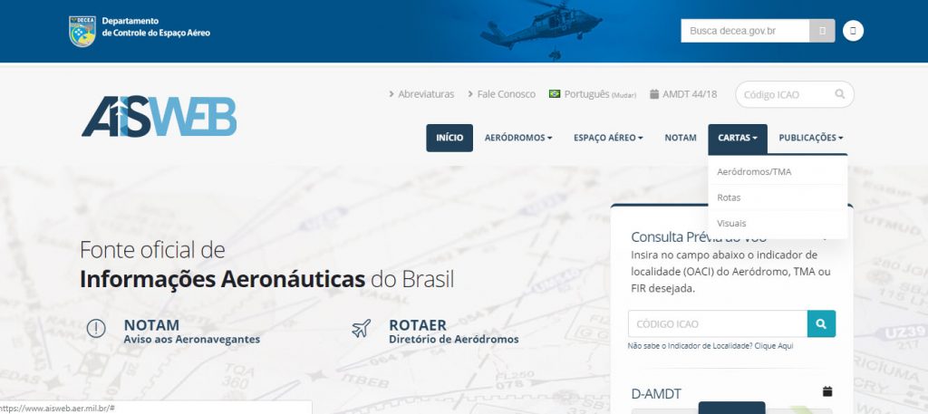 O primeiro passo é acessar o endereço www.aisweb.aer.mil.br, em seguida passando o mouse em cima de Cartas, você vai ver 3 opções de opções de cartas conforme imagem abaixo.