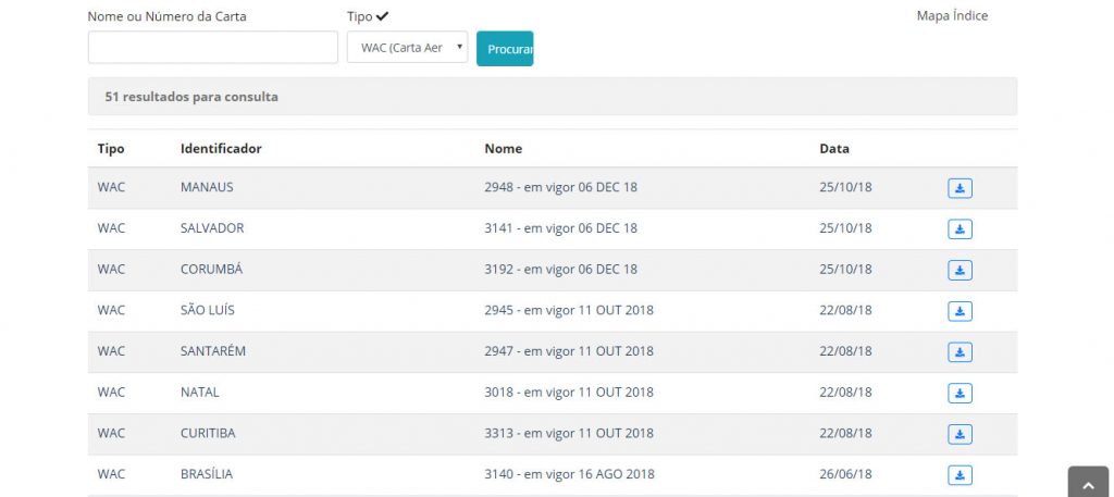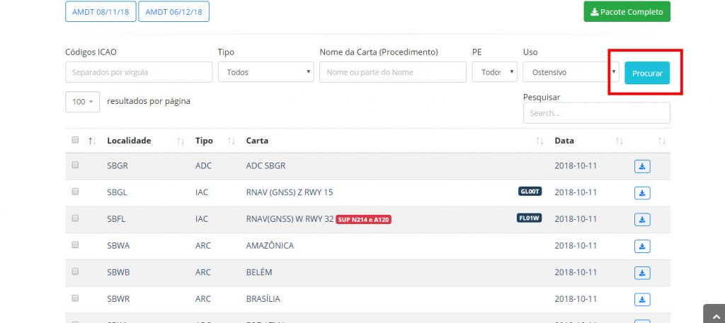 Lembrando sempre que para alguns aeródromos você terá uma grande quantidade de cartas para baixar. Então pode filtra-las em “Tipo” no menu superior, aqui você pode buscar por diversos tipos de cartas.