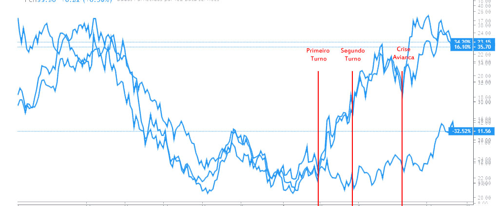 Após o segundo turno o crescimento se manteve e foi ainda mais acelerado voltando quase ao patamar do início do ano. Finalmente o terceiro ponto de crescimento se deu após a crise da Avianca, quando as ações superaram os índices do começo do ano.